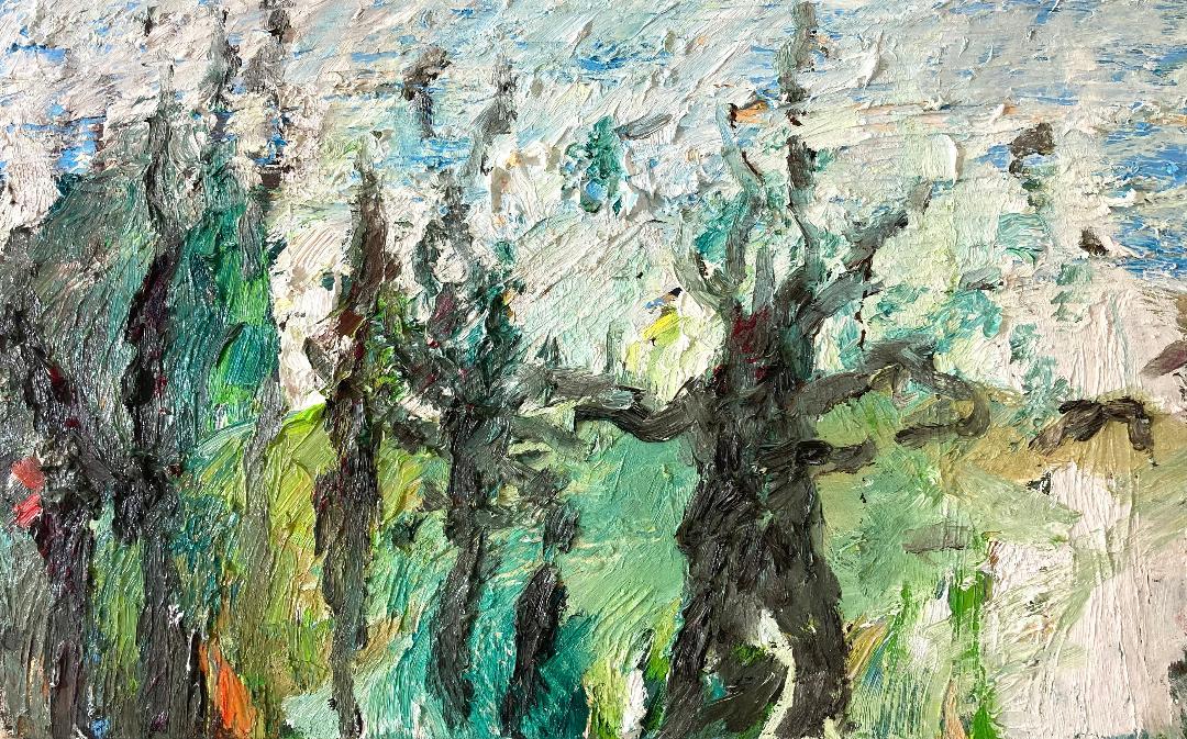 Concierto para tres cipreses, venticuatro estrellas, dos arbustos y un cello, 50 x 40 cm, Öl auf Leinwand, 2023 (Privatbesitz)