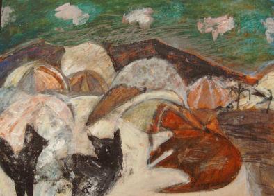 Gatos en la playa, 50 x 40 cm, Mischtechnik auf Holz, 2000
